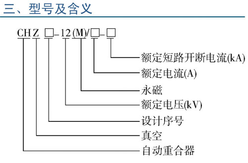 CHZ□—12(M)系列户外高压真空自动重合器(以下简称重合器)适用于交流50Hz、电压10~12KV的三相配电网络系统,该重合器是能够按照预定的开断和重合顺序在交流线路中自动进行开断和重合操作,并在其后自动复位或闭锁的自具控制保护功能的高压开关设备,与分断器等配合使用,可以不靠另外控制系统实现配电自动化,这种系统可以快速分段和隔离故障,将停电范围缩至较小,是城网农网改造的理想设备。重合器由断路器本体、电压互感器及重合控制器组成。